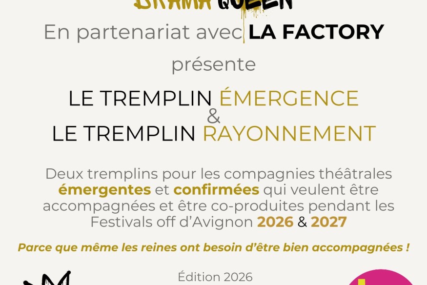 DRAMA QUEEN FOREVER et DRAMA QUEEN ACCOMPAGNEMENT & FORMATION, offrons la possibilité en 2026 et 2027, à tout artiste qui souhaite présenter son spectacle pendant le Festival OFF d’Avignon, d’être accompagné avant et pendant le Festival et de se produire dans une salle du Festival en ayant à disposition un demi créneau dans un théâtre partenaire, assorti d’une aide à la production et à l’accompagnement :Trois tremplins sont à remporter :Tremplin DRAMA QUEEN 2026 :1/ Tremplin destiné aux compagnies émergentes, d’une valeur de17 000 €- DATE DE CLÔTURE :......