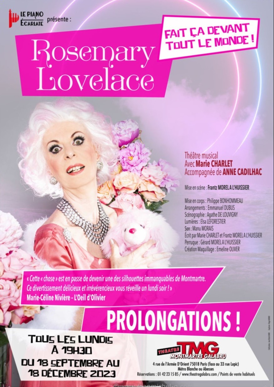Le récit est ponctué d’airs coquins et fantaisistes majoritairement issus du répertoire des années 20-30 (Mistinguett, Charles Trenet, Colette Renard…) avec quelques clins d’œil à Boris Vian, Lio et Dalida. Et comme Rosemary Lovelace veut rester « in », elle proposera au public une fin très interactive.