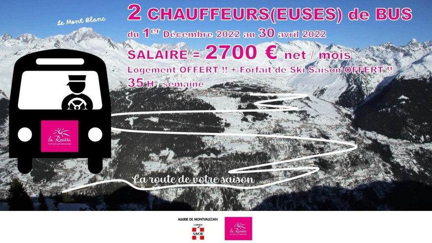 La mairie de Montvalezan La Rosière recrute pour la prochaine saison d'hiver 2022-2023, 2 chauffeurs-chauffeuses de bus pour assurer le service de la ligne "Bourg-St-Maurice, Séez, Montvalezan et Villages, La Rosière".
